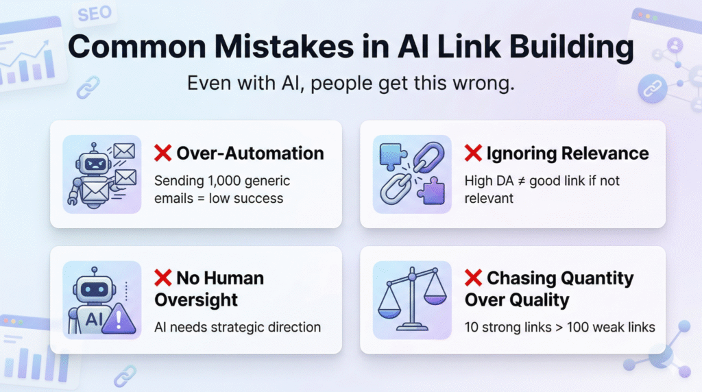 An Infographic explaining the common Mistakes that occur in AI Link Building (Credit: Gemini)
